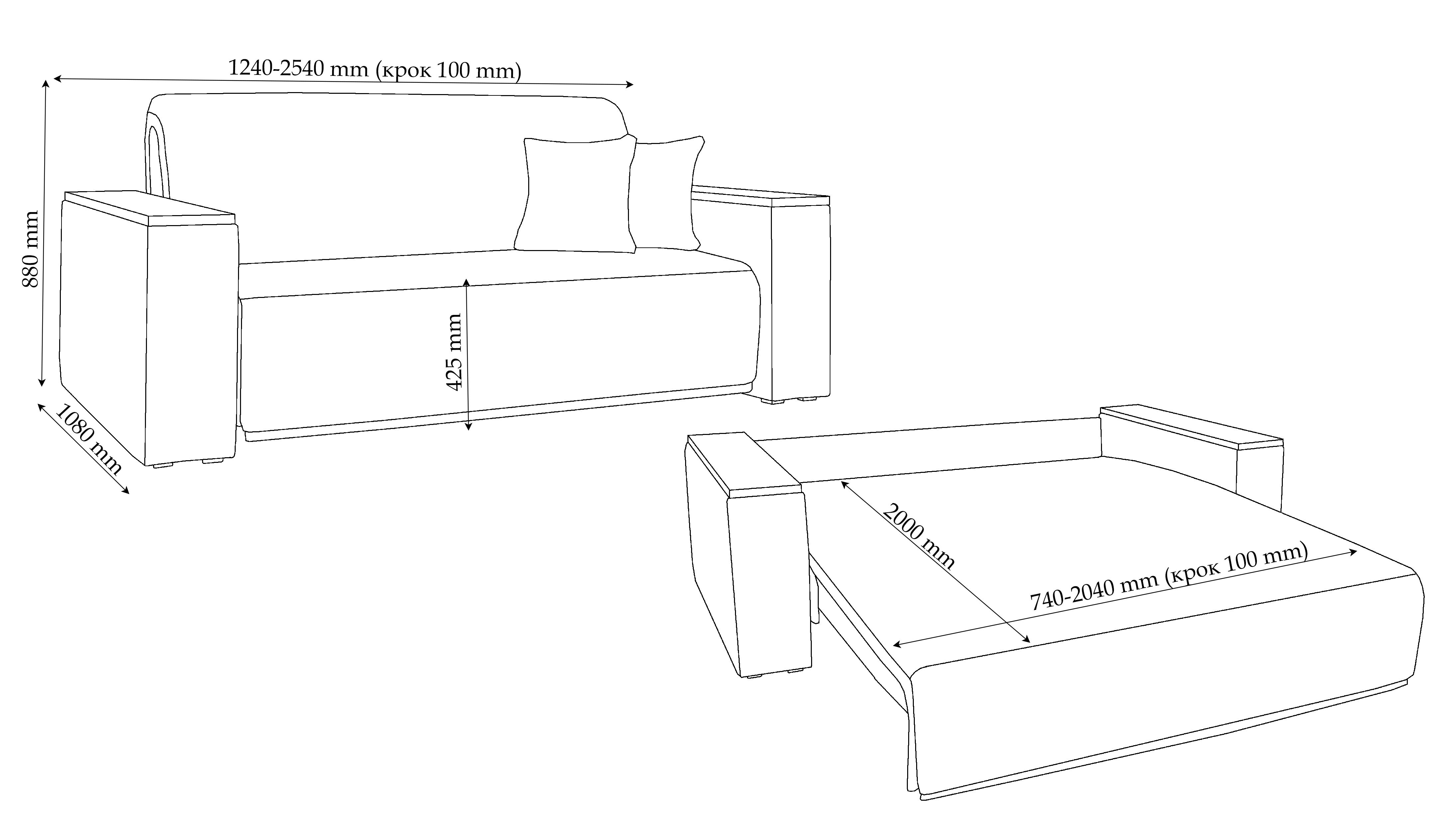 Розміри спального місця можуть бути від 78 до 208 см (інтервал 10 см) х 200 см.