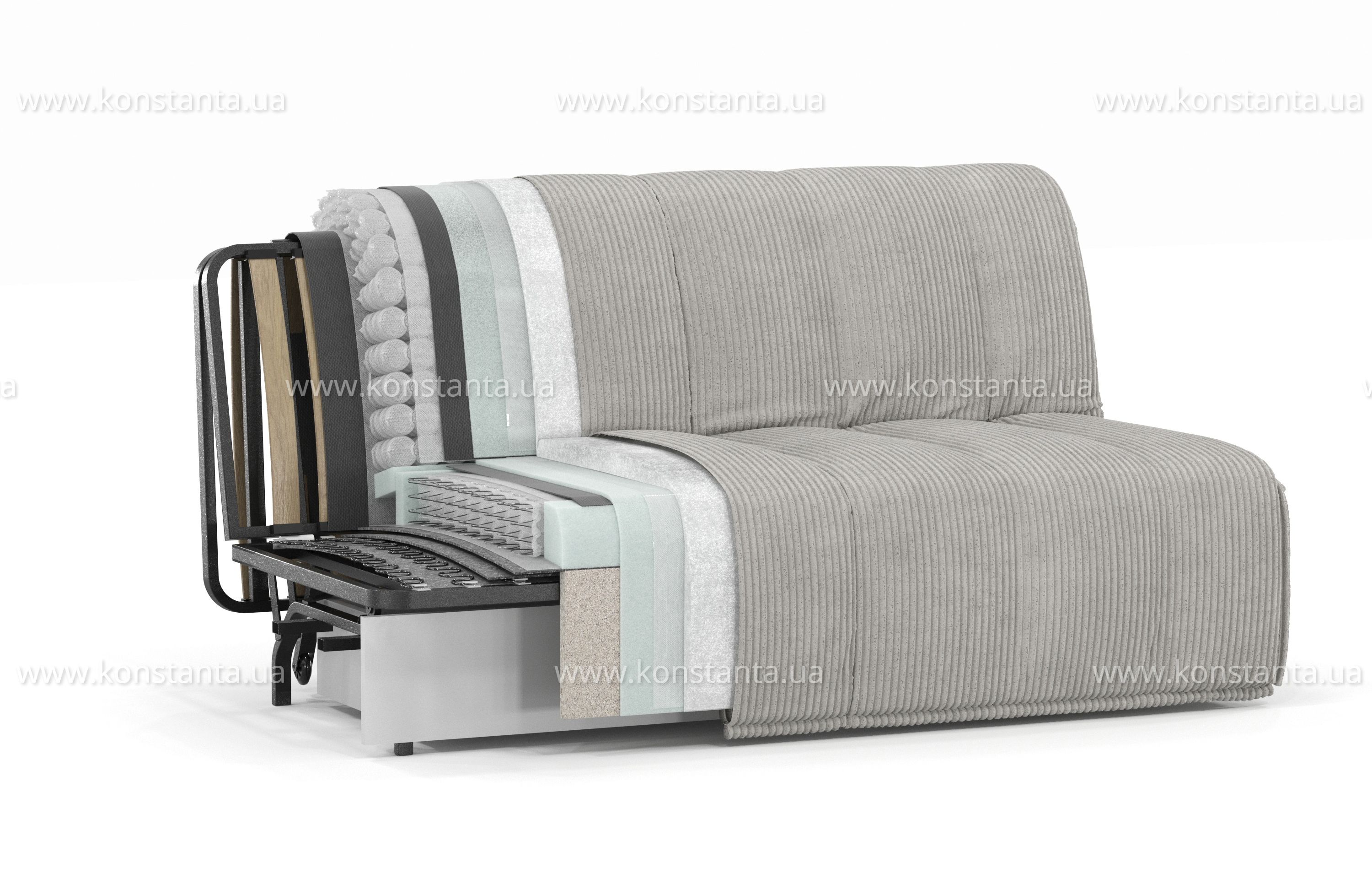 У основі дивана металевий каркас та матрац з блоком незалежних пружин Pocket Spring. У першій секції каркаса для більш м'якої та комфортної посадки використовується пружина-змійка, а в основі спального місця (у складеному вигляді – спинка дивана) використовуються букові ламелі.