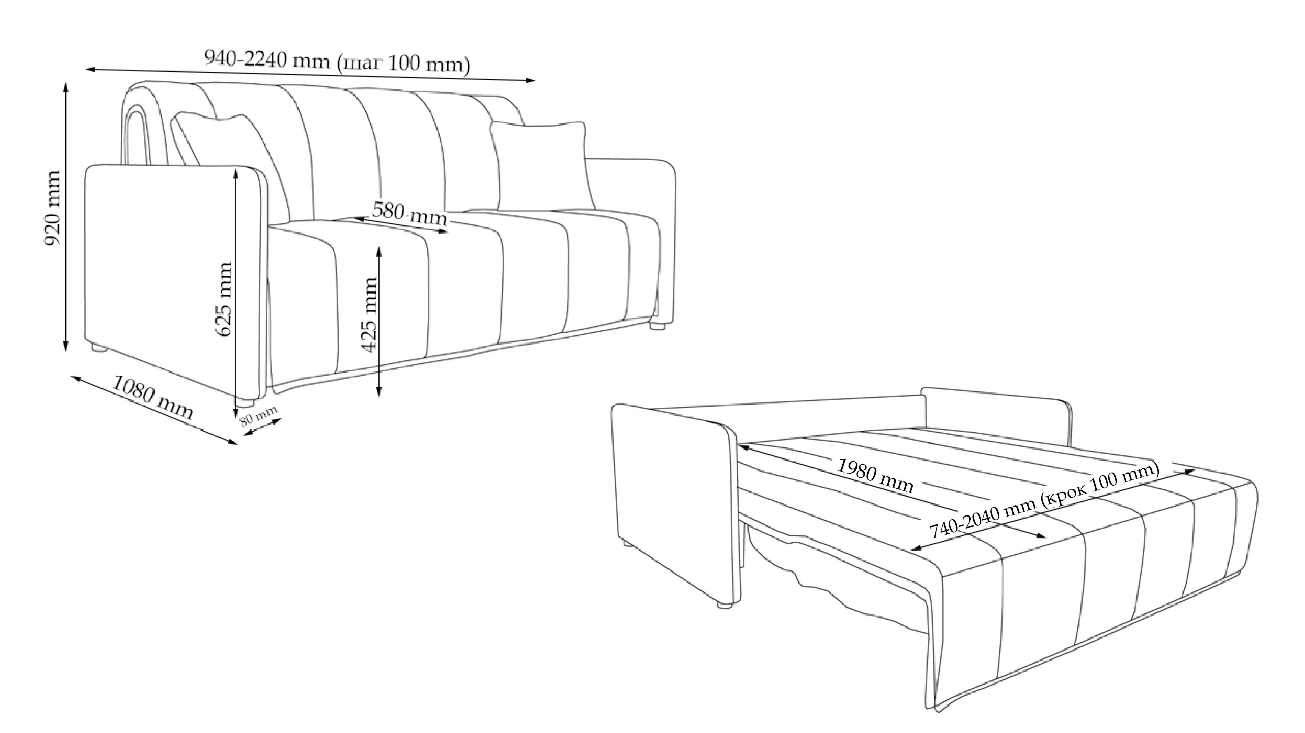 Спальне місце може бути шириною від 74 до 204 см (інтервал 10 см), це дозволить вибрати найбільш підходящий для Вас розмір дивану.