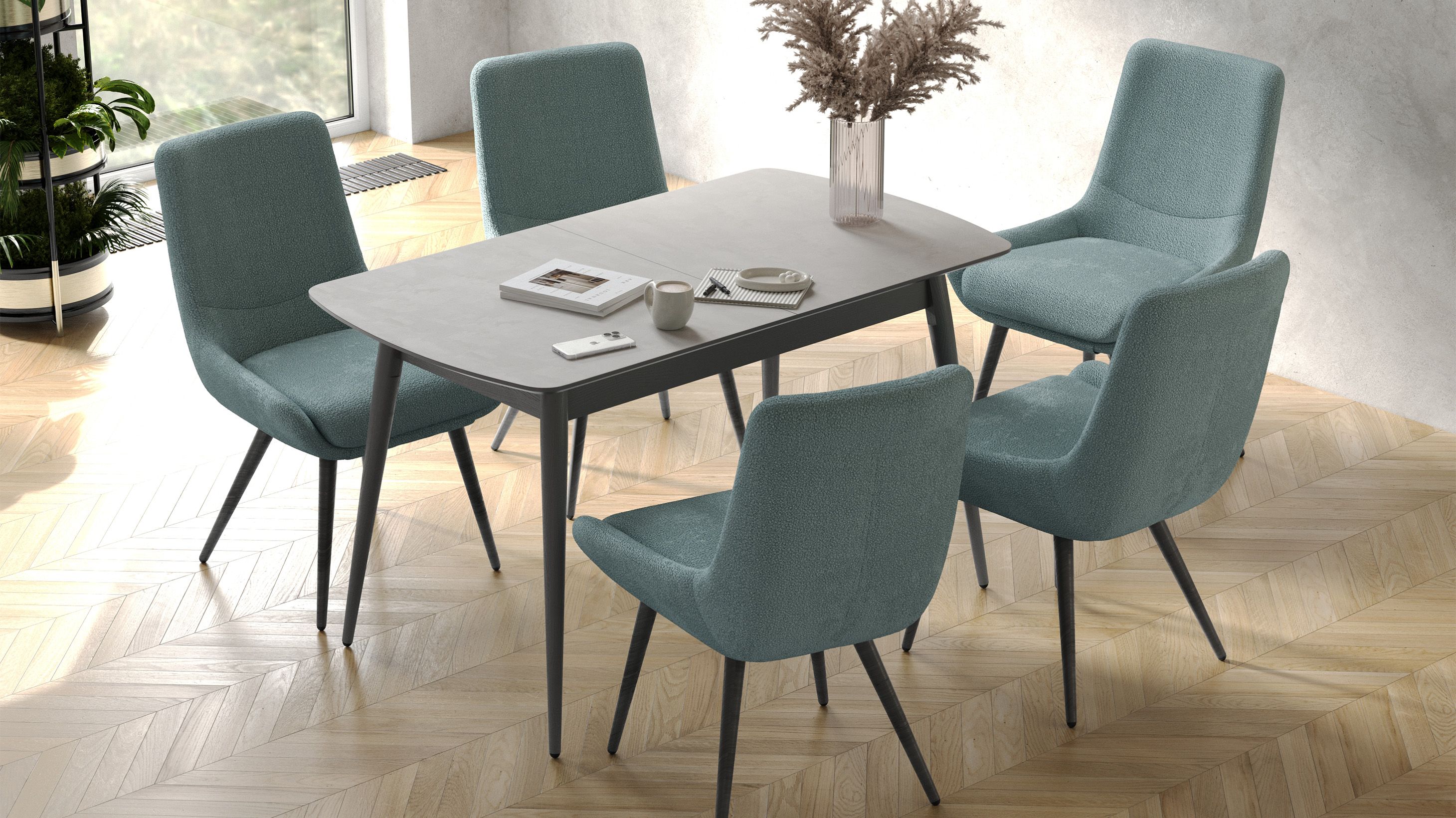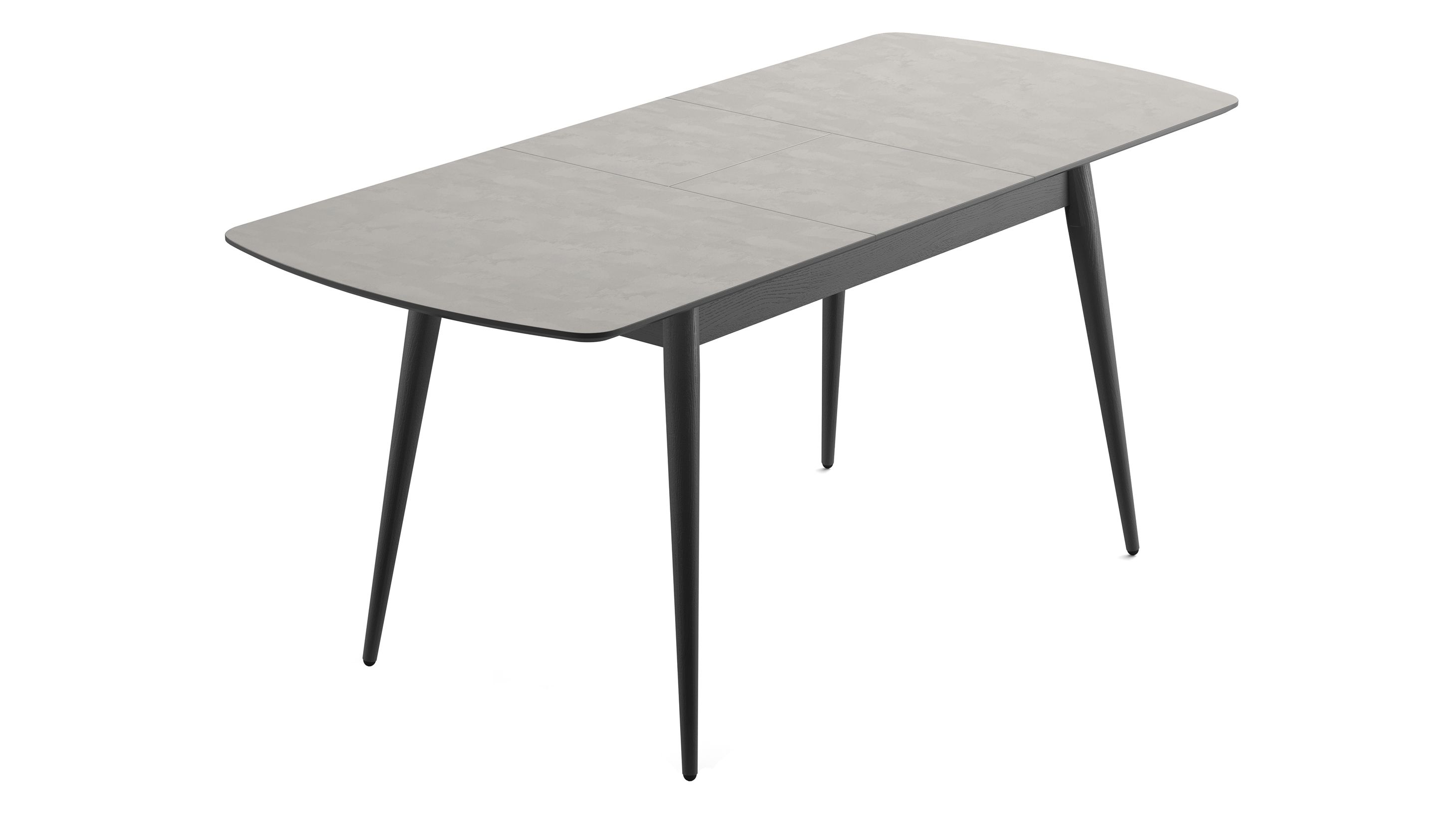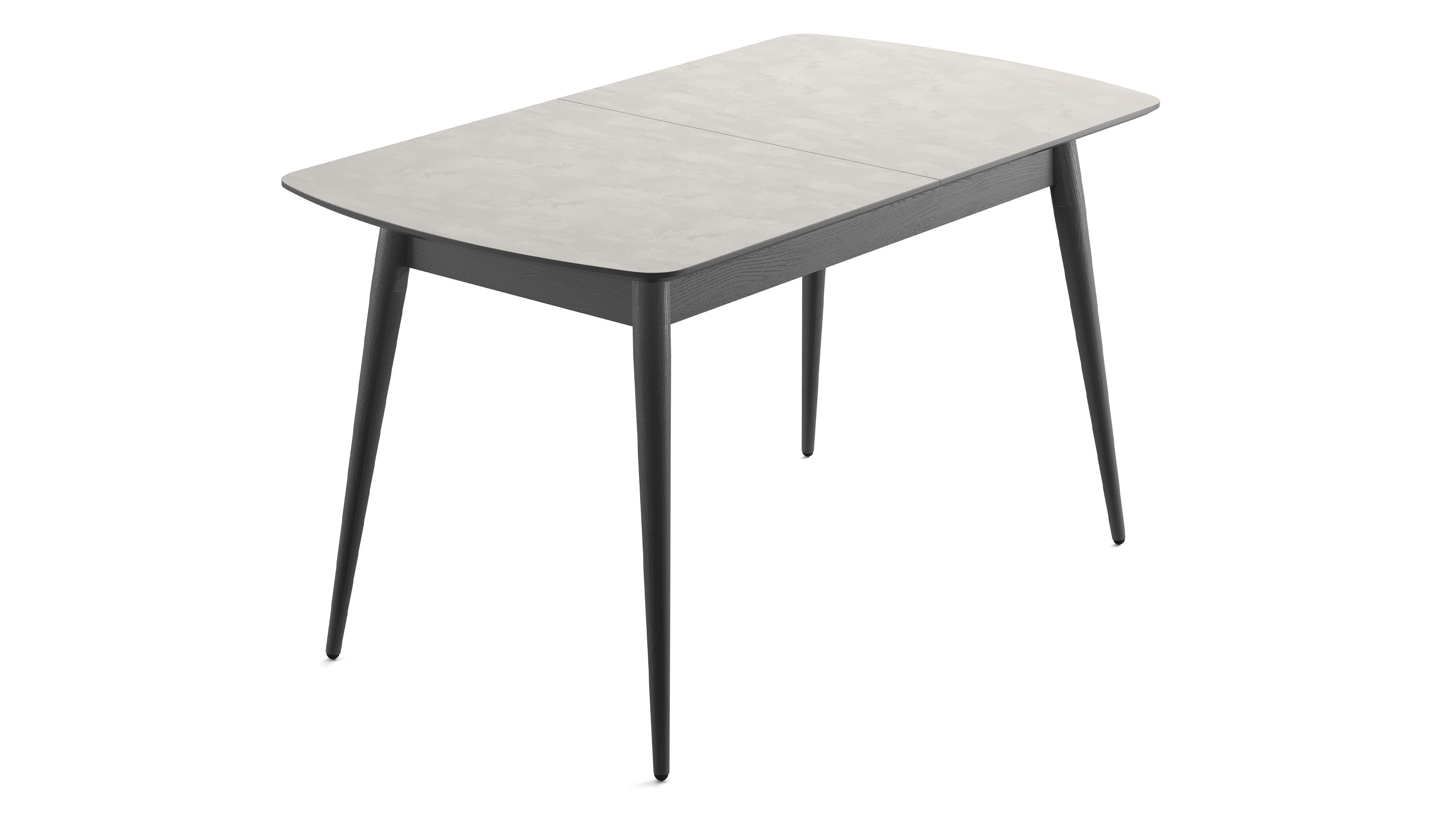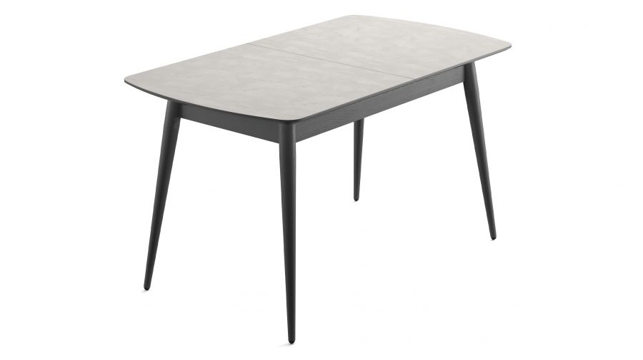 Стільниця з ДСП «Шовковий камінь» має ніжну матову текстуру, а торець пофарбований у відтінку графіт — разом вони виглядають стримано й сучасно. Ніжки виготовлені з масиву ясеня в кольорі графіт— міцного й довговічного дерева, яке служить роками. У складеному вигляді він легко розмістить 4–6 осіб.