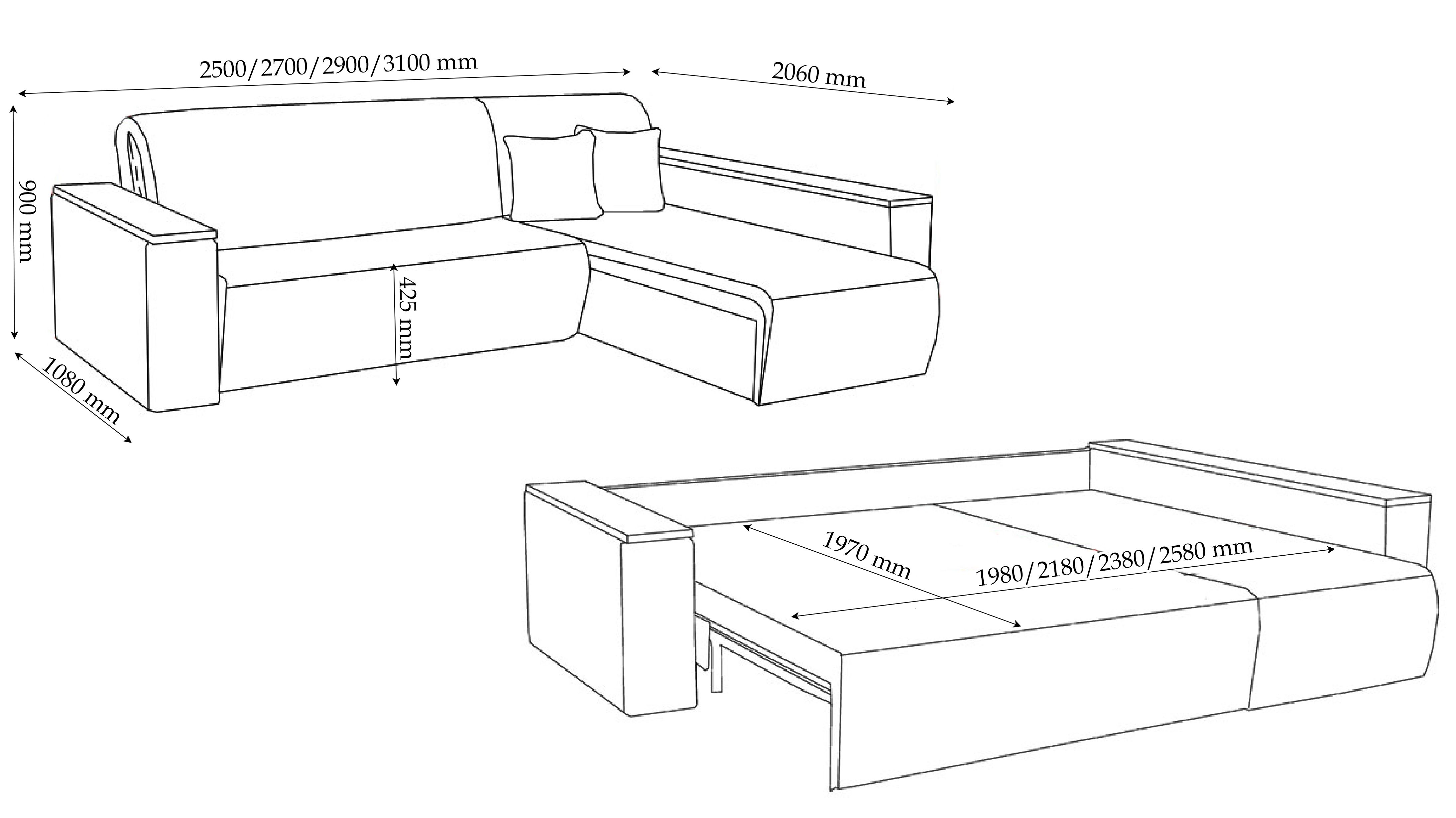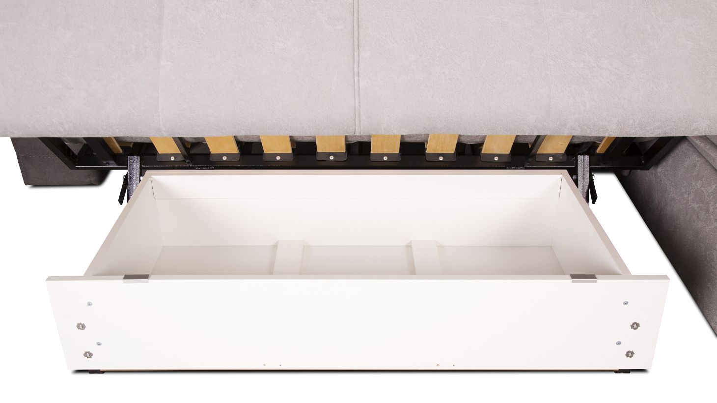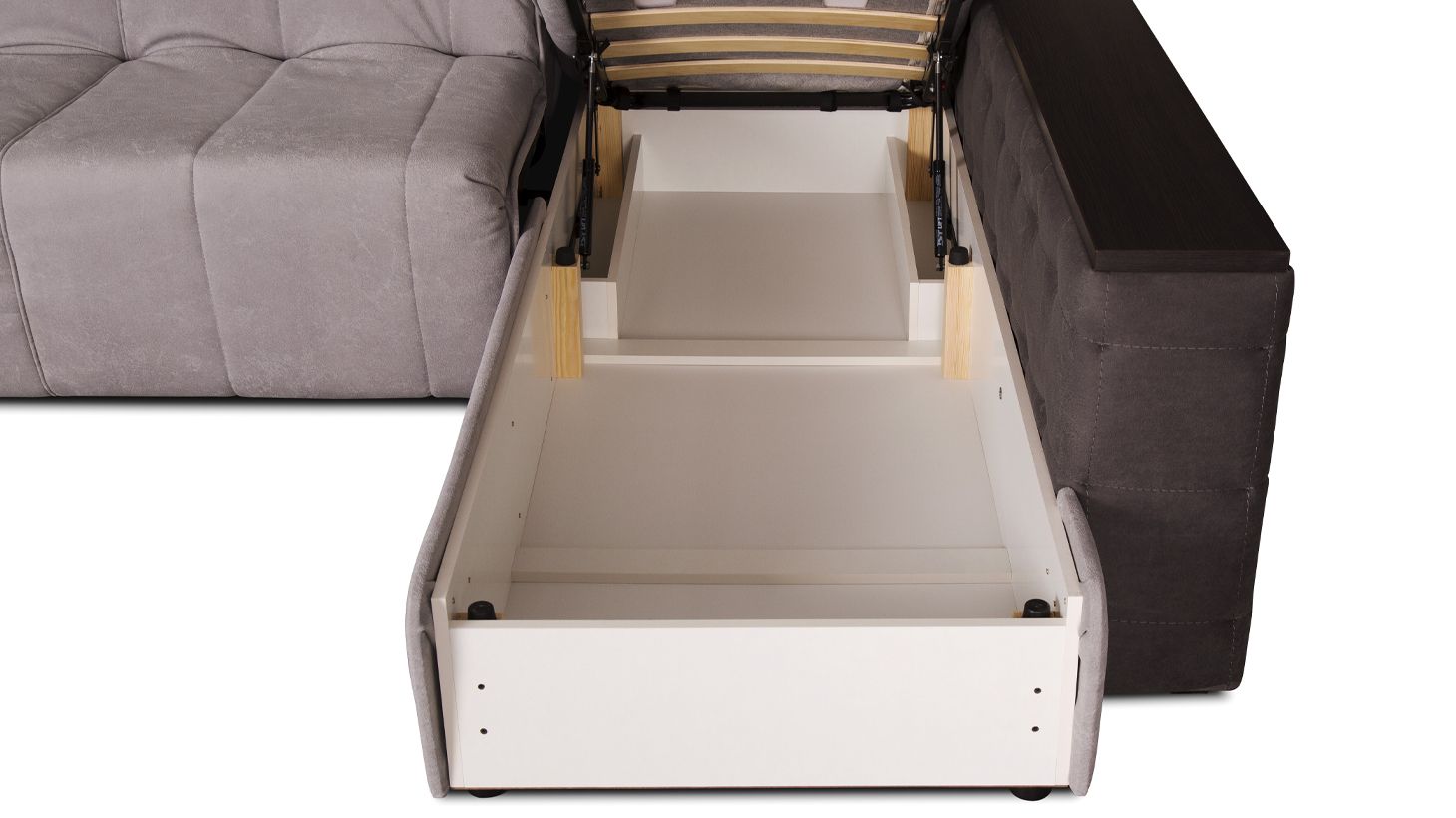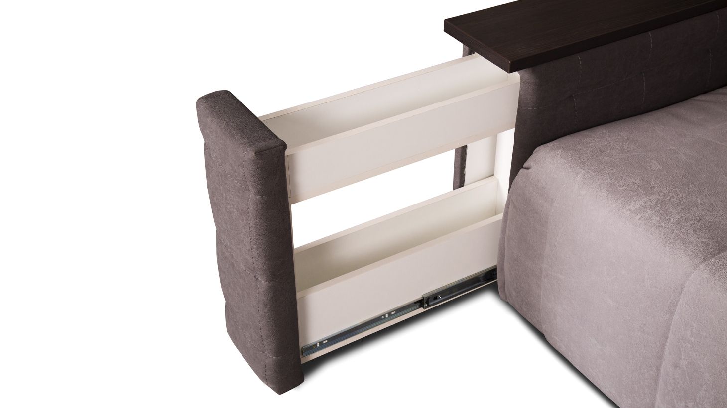 Є місткий білизняний короб під сидінням, білизняна ніша в довгому підлокітнику і бар в короткому підлокітнику.