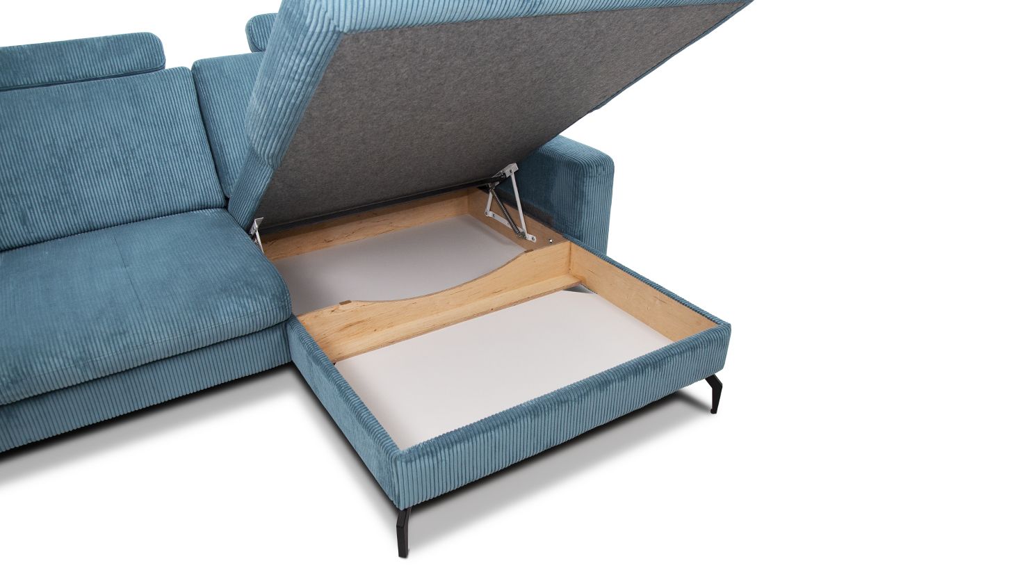 В даній моделі передбачений місткий короб у кутовій частині, в ньому зручно зберігати постільну білизну та інше спальне приладдя.