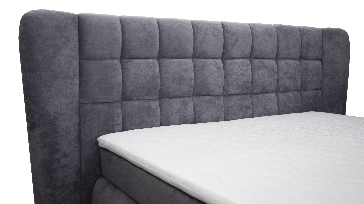 Високе об'ємне узголів'я, виконане квадратами, створює відчуття глибини та деталізації, а закруглені вигнуті краї додають стиль до загального дизайну ліжка.