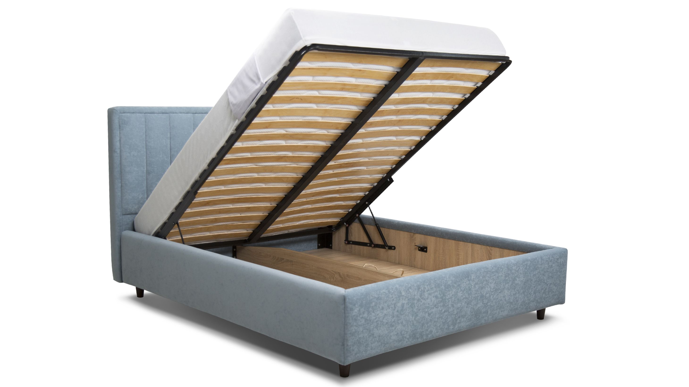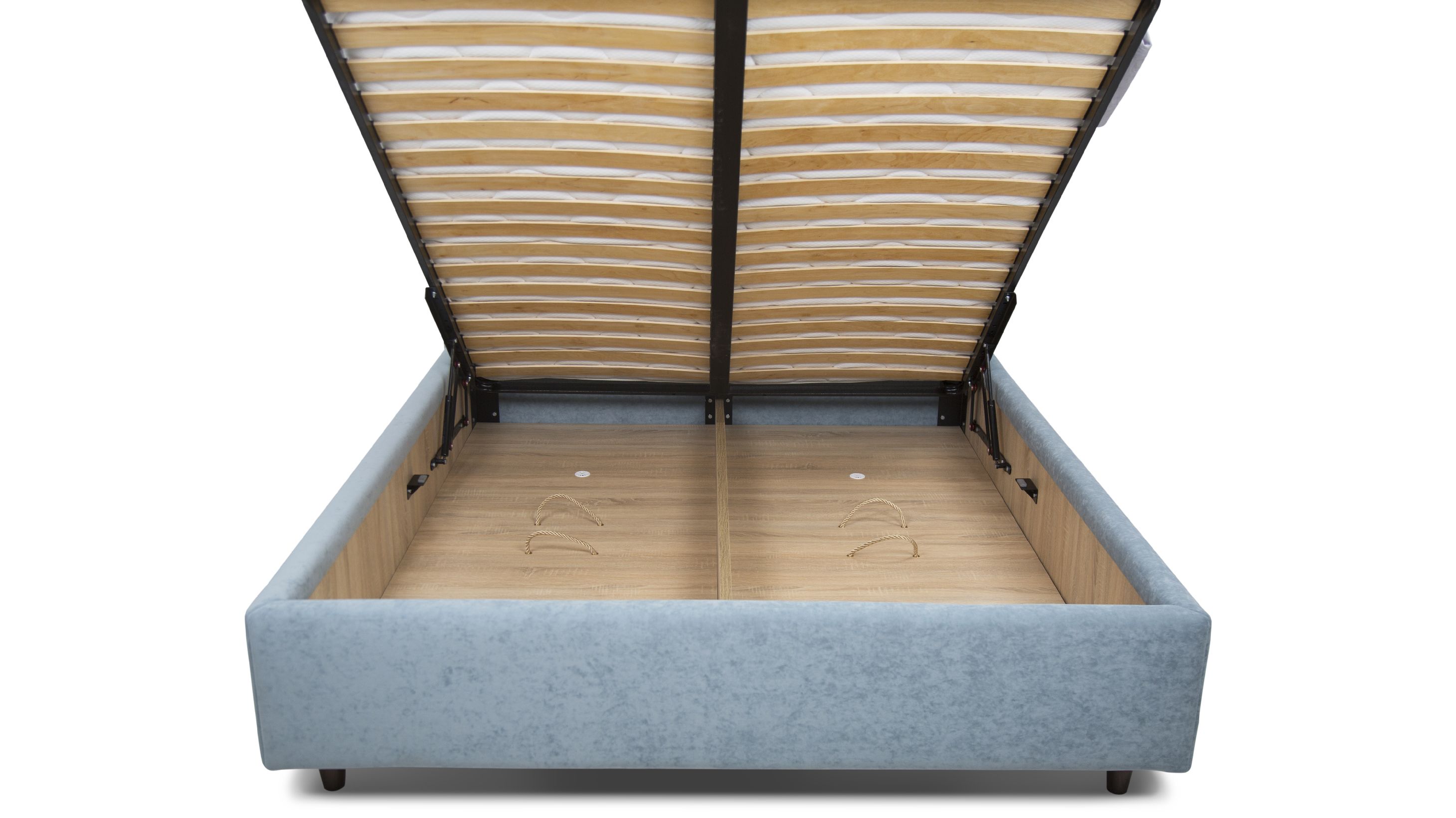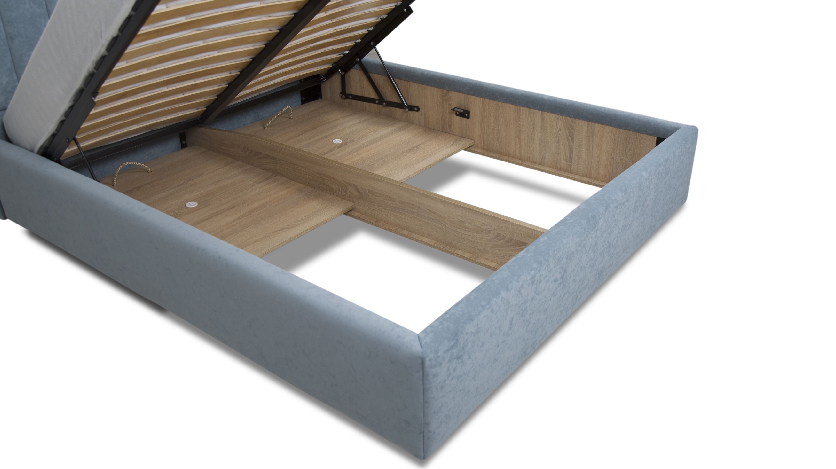Ліжко за замовчуванням оснащене підйомними механізмами на газових амортизаторах та коробом для білизни. Ніша повністю виконана з ДСП 16 мм кольору дуб сонома, що надає ліжку більш естетичного вигляду.