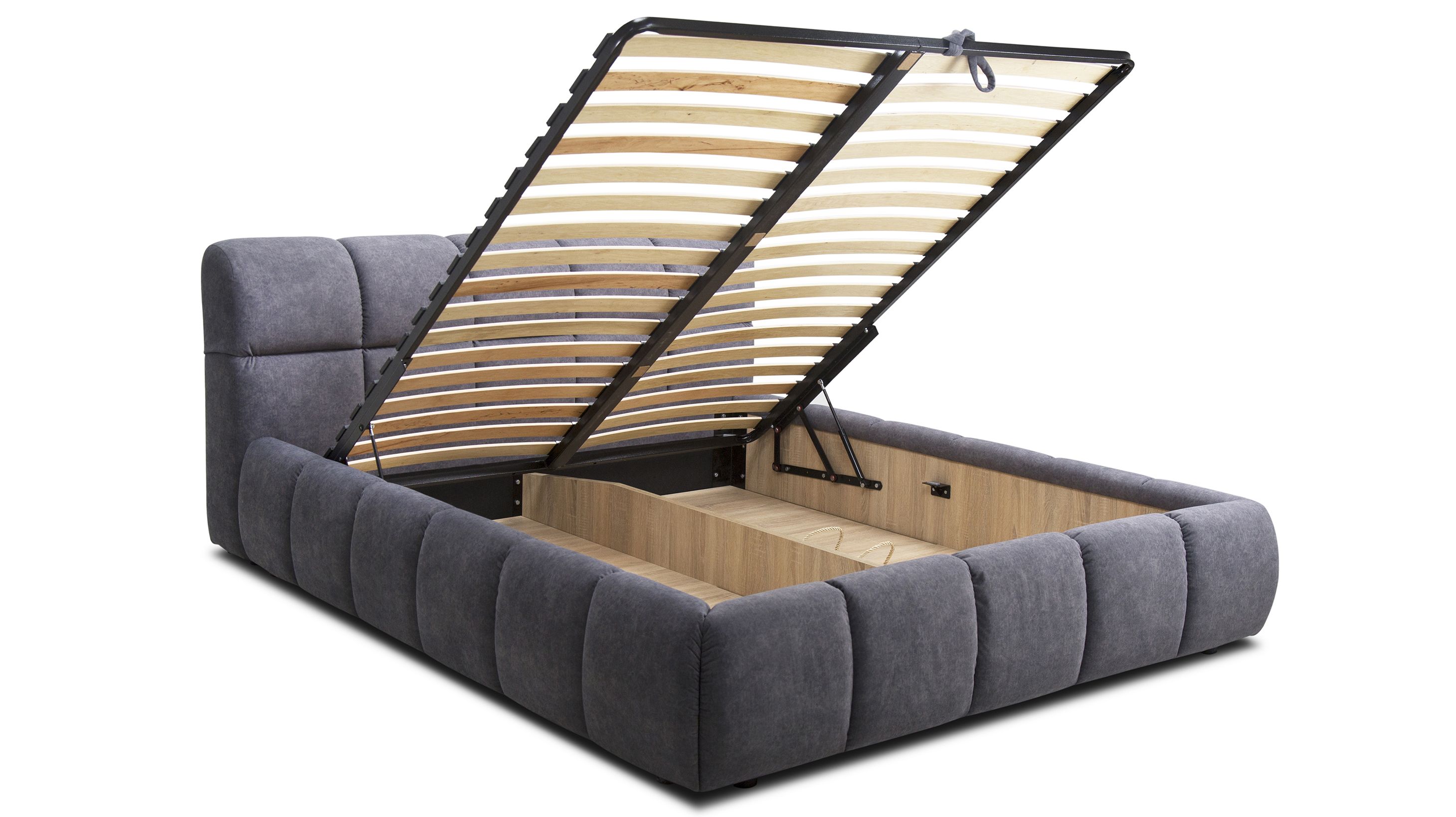 Ліжко за замовчуванням оснащене підйомними механізмами на газових амортизаторах та коробом для білизни. Ніша повністю виконана з ДСП 16 мм кольору дуб сонома, що надає ліжку більш естетичного вигляду.