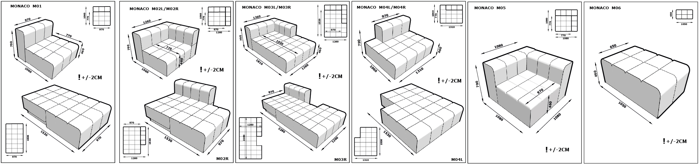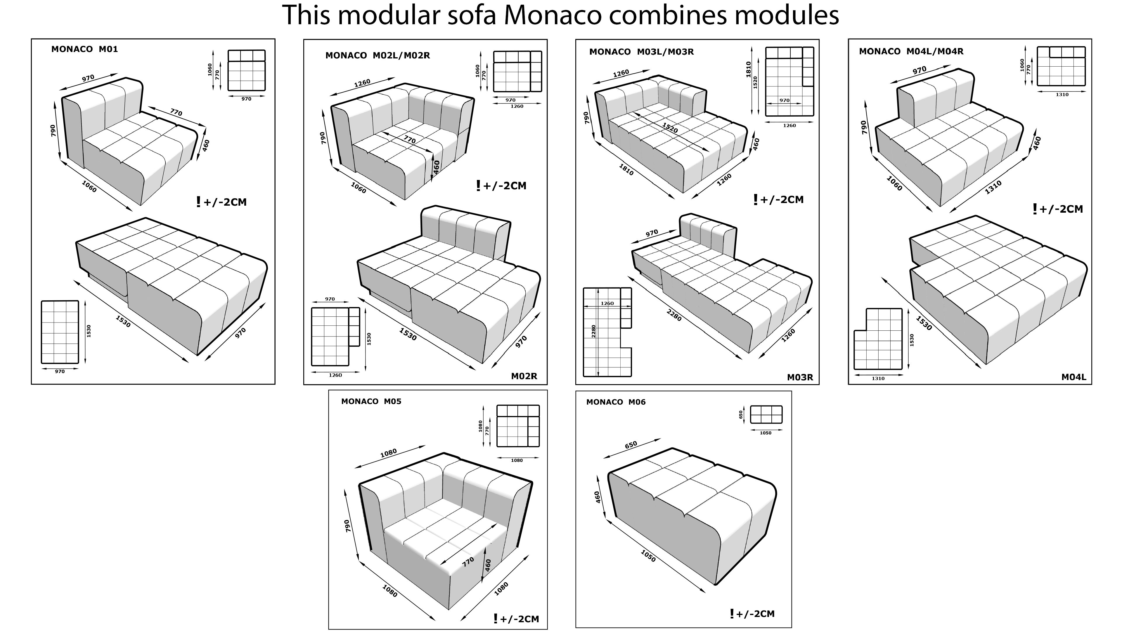 Диван Монако складається з окремих частин (модулів), які можна з'єднувати між собою в різних комбінаціях. Ви можете змінювати форму дивана, додаючи або видаляючи модулі: робити кутовий, прямий, П-подібний або навіть окремі розкладні крісла.