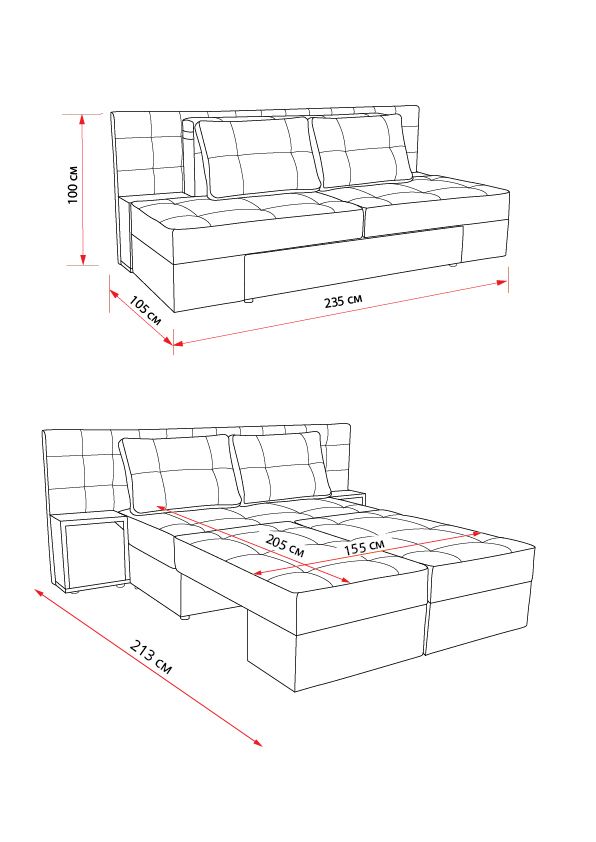 В дивані використовується новий механізм трансформації "Ножиці", за допомогою якого диван перетворюється в затишне ліжко з двома тумбами.