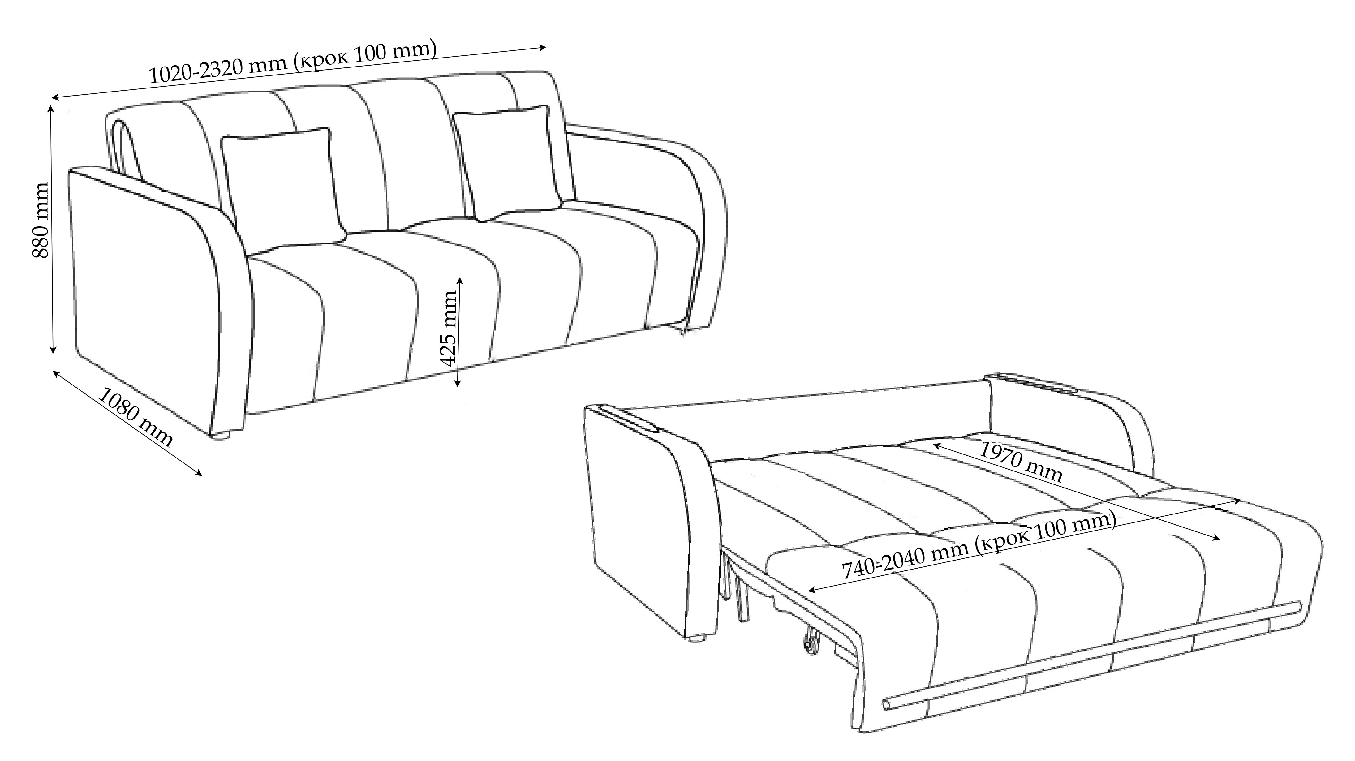 Спальне місце у даній моделі може бути шириною від 78 до 208 см (інтервал 10 см), саме тому Ви маєте змогу самостійно обрати відповідний Вам розмір дивану.