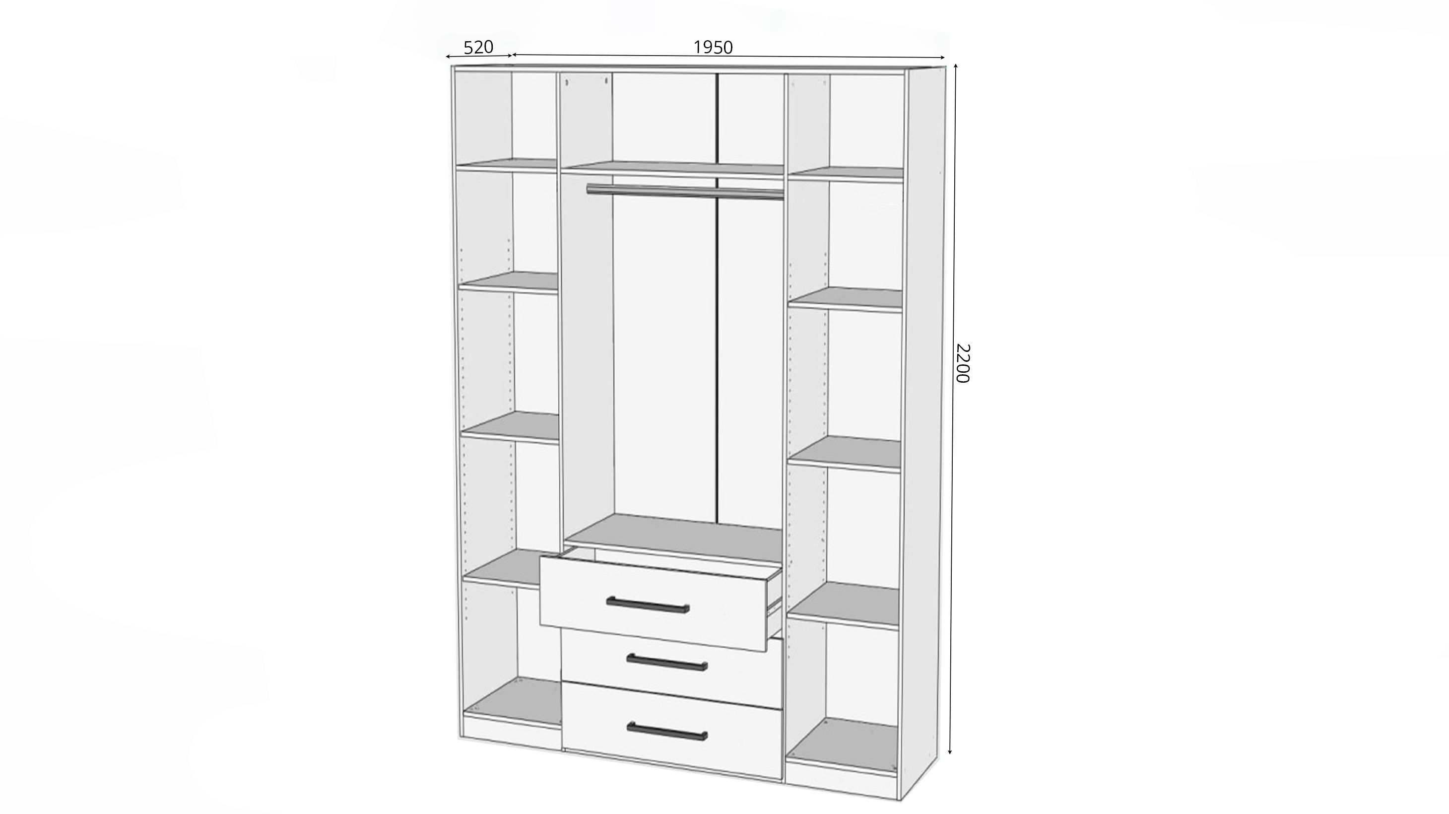 Внутрішнє наповнення продумане для зручності: секція зі штангою для довгого одягу, дві секції з полицями для складених речей та три висувні шухляди, які дають можливість утримувати порядок серед дрібних речей.