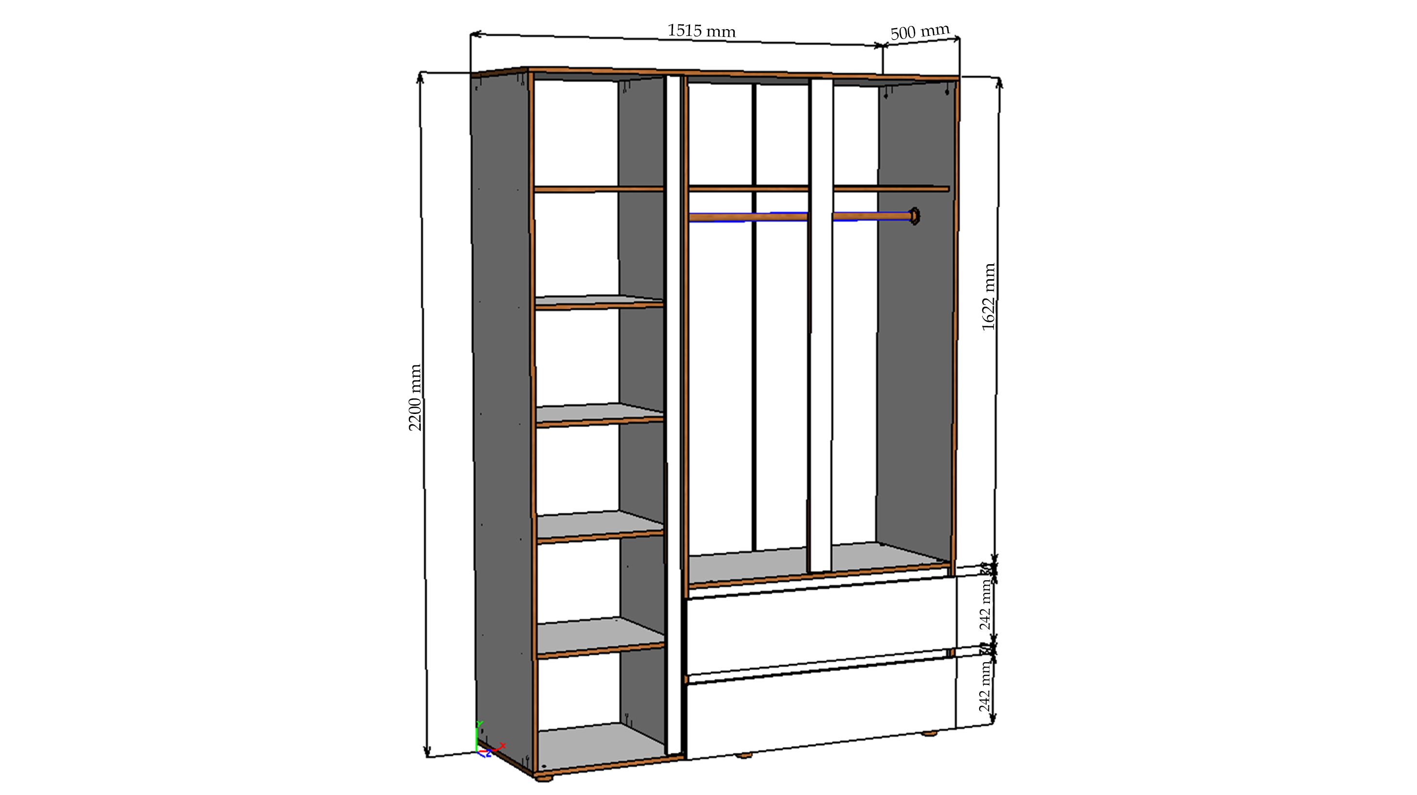 Розміри шафи забезпечують достатньо місця для зберігання одягу всієї сім'ї, при цьому шафа виглядає стильно й не перевантажує кімнату. Ця модель стане зручним вибором для тих, хто шукає тридверну шафу для одягу з полицями, штангою та висувними шухлядами, що поєднує місткість і сучасний дизайн.