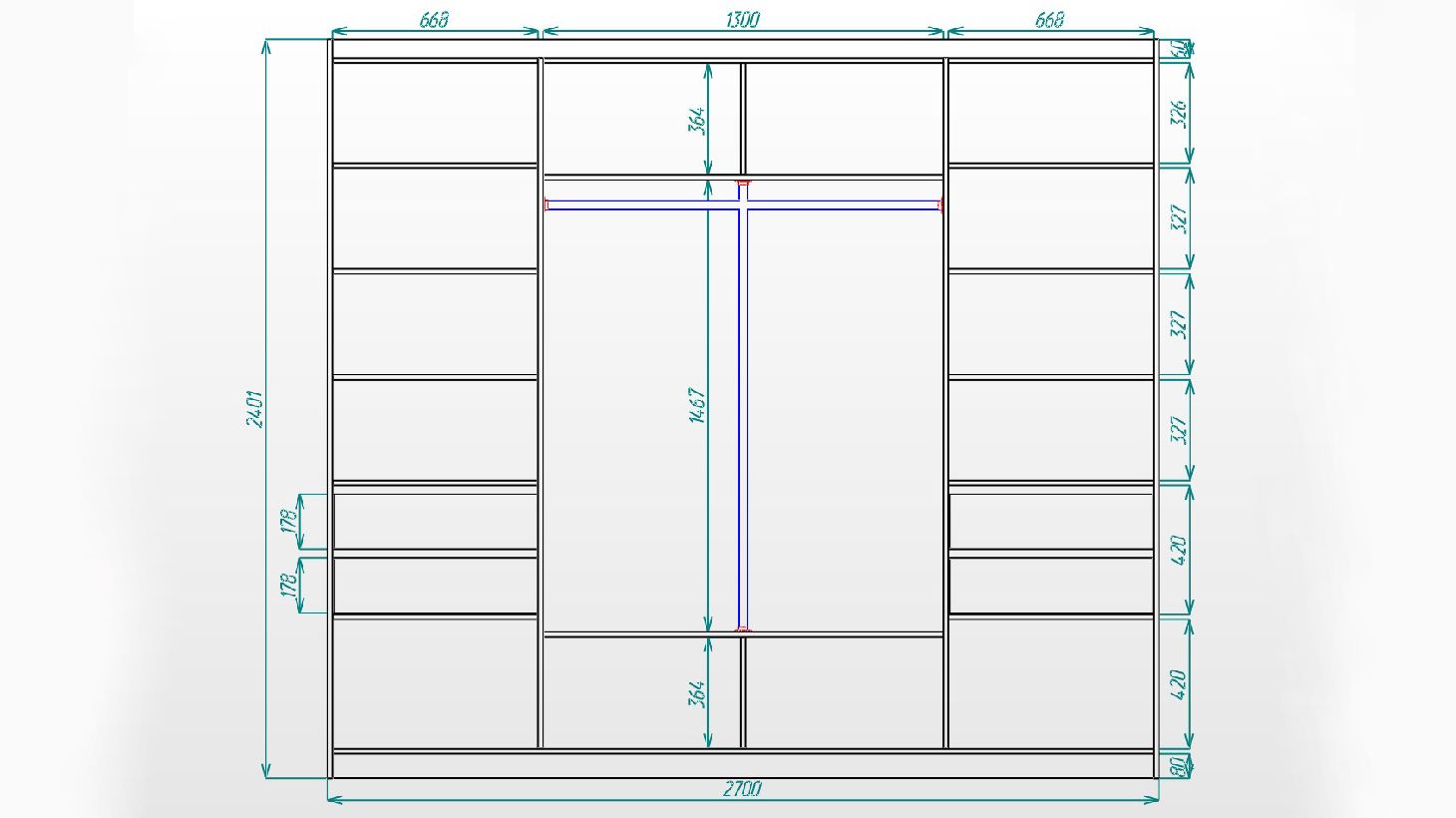 Фасад складається з 5 сегментів. Бічні двері виготовлені з ДСП Німфея Альба, Центральні двері дзеркало Срібло.