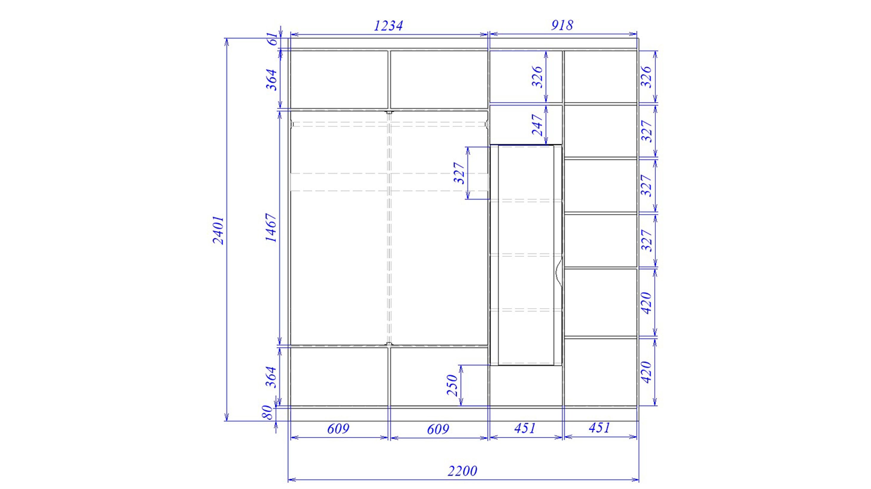 Внутрішній простір шафи продуманий до дрібниць:широкі полиці для розміщенні складеного одягу; довга штанга для вішалок — ідеальна для зберігання костюмів, суконь та інших речей без зминання; внутрішнє дзеркало; за потреби можна встановити додаткові висувні шухляди для білизни та аксесуарів.